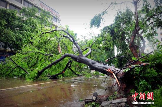 7月19日,受超强台风“威马逊”影响,徐闻县区到处可见折断倒地的树木。7月18日晚,今年第9号台风“威马逊”(超强台风级)在广东省徐闻县市龙塘镇沿海再次登陆,登陆时中心附近最大风力仍有17级(60米/秒),是41年来登陆中国华南地区的最强台风。 中新社发 陈骥旻 摄