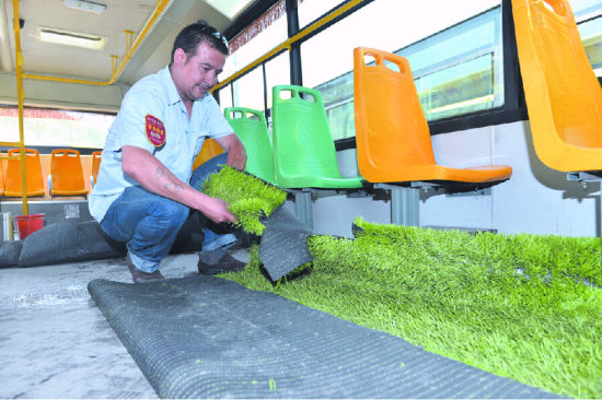 铺了草皮的公交车开出后,乘客反映很好。“有的乘客一上来看到绿色的草坪,有的拍照,有的还弯腰触摸一下。”外力·吐尔迪开心地对记者说。