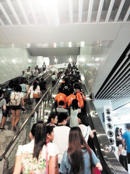 在长沙地铁站内,自动扶梯上左右站立的场景很常见。刘练 周和平 摄影报道记者 周和平 实习生 刘练 黄康