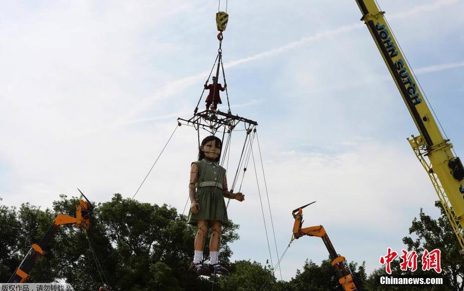 当地时间2014年7月25日,为纪念第一次世界大战爆发100周年,英国利物浦市迎来法国著名木偶剧团皇家豪华的3个巨型木偶,聆听木偶们讲述的一战故事。图为身高5.5米高的小女孩。