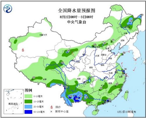 2日08时至3日08时, 青海东北部、西藏东南部、云南大部、重庆中部、广东珠江口附近、上海、江苏东南部、山东半岛东部、河北北部、黑龙江中东部等地的部分地区有中到大雨,其中,云南西部和东南部、广东珠江口附近的局部地区有暴雨(50~80毫米);上述部分地区并伴有短时雷雨大风等强对流天气。黄海中部和南部、东海北部有7~9级旋转风,其中,东海东北部、黄海东南部的风力可达10级、阵风11~12级。