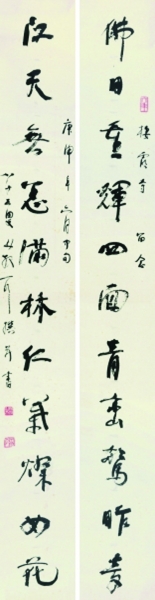 事情仍未了结,有不少人猜测此副对联是否伪作?业界行家的“说话”是否可以“算数”?如果是真迹,究竟是如何从林老家中流出的?各界都在呼吁权威说法。昨日下午,匡时副总谢晓冬携刚刚拍出去的天价对联赴南京,请最具说服力的林散之之子、著名书画家林筱之先生掌眼。当对联缓缓展开,一个个大字确给人神采焕然之感。林筱之肯定地说:这个字,别人仿不出来,“连我都写不出来”,无论功力还是笔墨技巧上,都是一般人做不到的“人书俱老”境界,“是可以代表他本人风格的作品”。此时林散之已85岁高龄,正是书法艺术的巅峰期。同时,自认“诗第一”的林老还亲自撰作这副长联:佛日重辉,四面青峦惊昨梦;江天无恙,满林红叶灿如花。