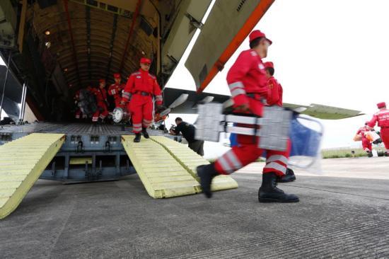 8月4日12时39分,空军航空兵某师伊尔-76运输机飞抵云南昭通机场,机上搭载了100名国家地震灾害紧急救援队队员,以及160多件救援器材和8条搜救犬,飞机着陆后救援人员立即展开救援。初步统计,截至8月4日8时40分,云南鲁甸地震“8.3”里氏6.5级地震已致381人死亡。中新社发 闵忠 摄图片来源:CNSPHOTO