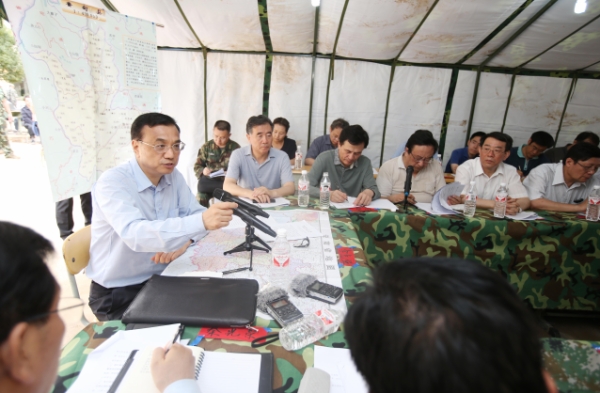 8月4日,中共中央政治局常委、国务院总理李克强在云南鲁甸地震震中龙头山镇实地察看灾情后,来到镇中学操场上的帐篷里,召开现场会,协调解决抗震救灾中的问题。