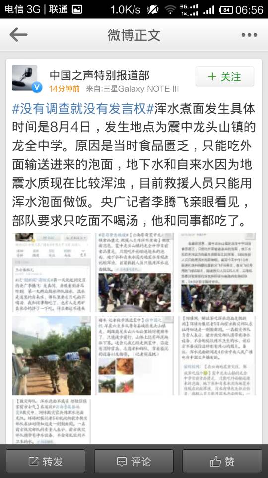 @中国之声【多名记者证实救援人员用浑水泡面做饭】针对@环球网微搏称中国之声记者所报道救援人员浑水煮面是假新闻的报道,我们专门向记者做了核实?;胨竺娣⑸咛迨奔涫?月4日,发生地点为震中龙头山镇的龙全中学。原因是当时食品匮乏,只能吃外面输送进来的泡面,地下水和自来水因为地震水质现在比较浑浊,目前救援人员只能用浑水泡面做饭。央广记者李腾飞亲眼看见,部队要求只吃面不喝汤,他和同事都吃了。