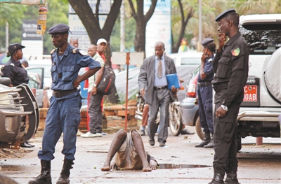 8月6日,几内亚科纳克里,警察在一名男子附近守卫,该男子倒在水坑中,附近民众因害怕该男子患埃博拉病毒而不敢靠近。
