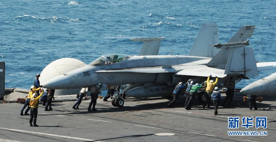 美军开始对伊拉克极端组织发动空袭这张美国海军8月8日提供的照片显示,在海湾地区执行任务的“乔治·H·W·布什”号航空母舰上,地勤人员指挥一架F/A-18C大黄蜂战斗机。新华社发