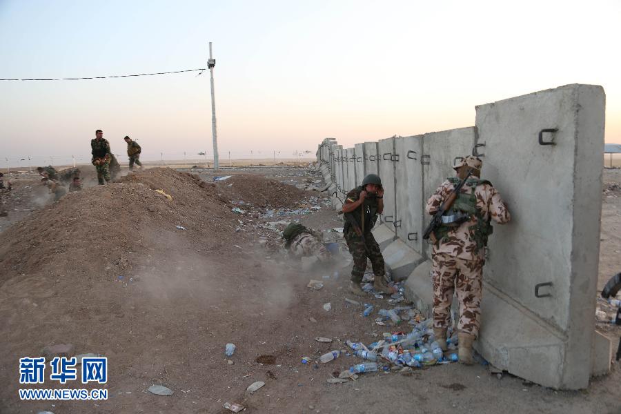 美军开始对伊拉克极端组织发动空袭8月8日,在伊拉克北部城市埃尔比勒郊外的一个检查站附近,库尔德武装组织成员躲避在掩体后。新华社发