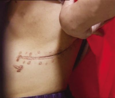 卖肾者展示左肾摘除后遗留的疤痕。