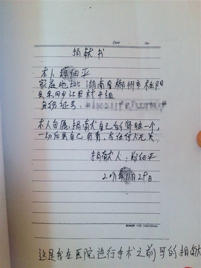 肾脏摘除前,供体被要求写自愿捐赠书。