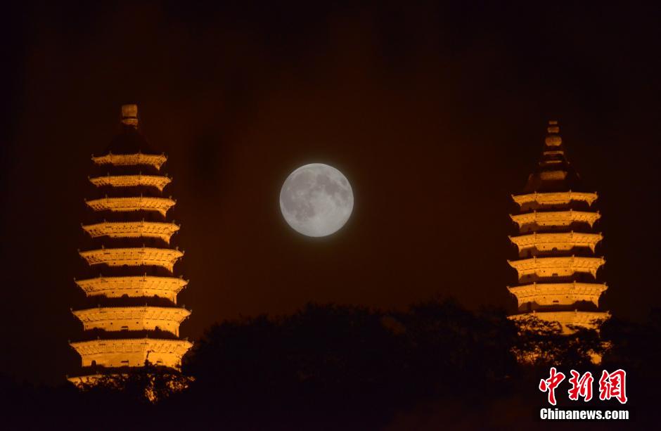 8月10日晚,一轮圆月亮相山西太原双塔寺上空。8月10日晚到11日凌晨,年度最大最圆的“超级月亮”将在空中上演。11日凌晨1点43分,月球运行到近地点,距离地球仅35.6896万公里。