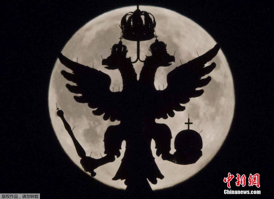 图为在俄罗斯莫斯科上演的“超级月亮”。