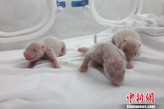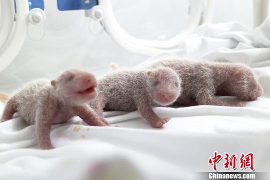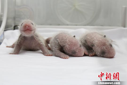 大熊猫“菊笑”产下的三胞胎幼仔?!〈笮苊ㄑ芯恐行墓┩肌∩?/p>