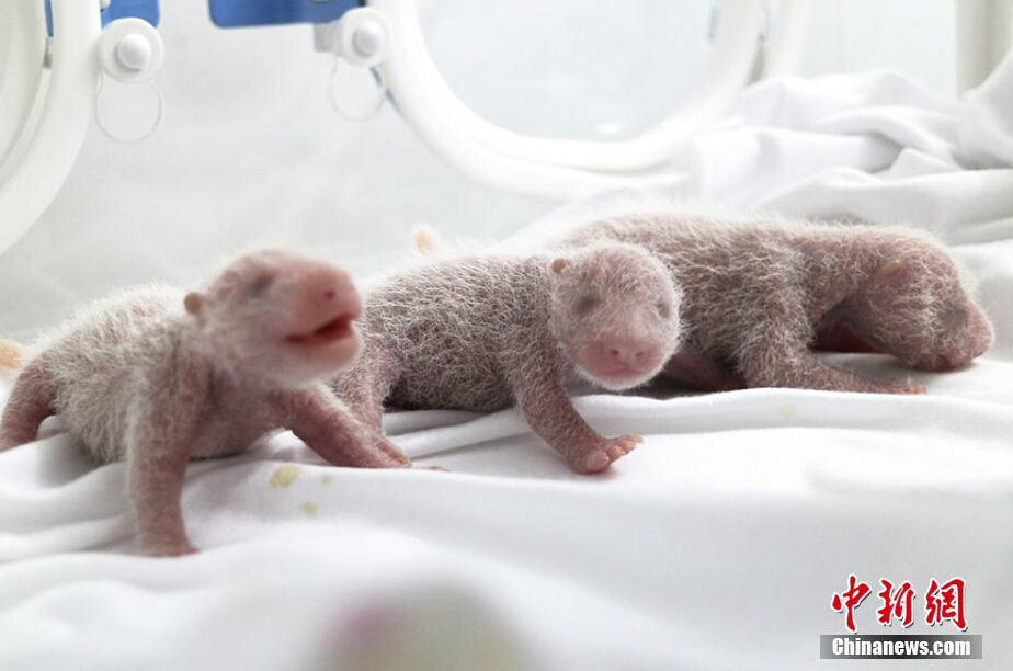 8月12日记者从中国?;ご笮苊ㄑ芯恐行幕裣ぃ粤笮苊?ldquo;菊笑”于7月29日凌晨在广州长隆野生动物世界顺利产下三胞胎熊猫宝宝。这是迄今为止中国保护大熊猫研究中心大熊猫第二次产下三胞胎,也是圈养大熊猫人工繁育史上有记载的第四个三胞胎,目前母子情况基本稳定。记者 安源 大熊猫研究中心供图
