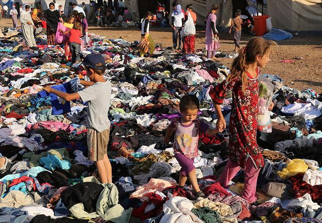 到达难民营的伊拉克人可以选择慈善机构捐赠的衣服穿。