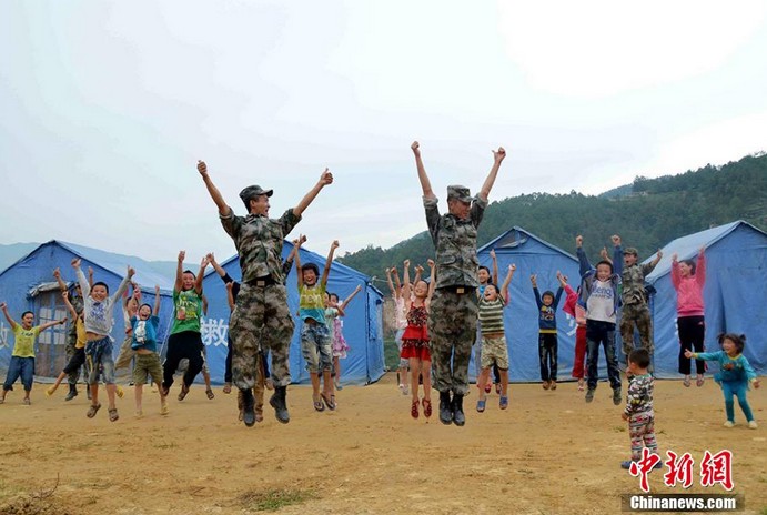 “你是我的小呀小苹果,怎么爱你都不嫌多,红红的小脸儿温暖我的心窝,点亮我生命的火,火火火火火。”为帮灾区孩子走出地震阴影,连日来,解放军陆军第十三集团军红军师炮兵团官兵在巧家县新店镇震区教小朋友跳小苹果。图为解放军教灾区小朋友跳“小苹果”。于炜彬 摄