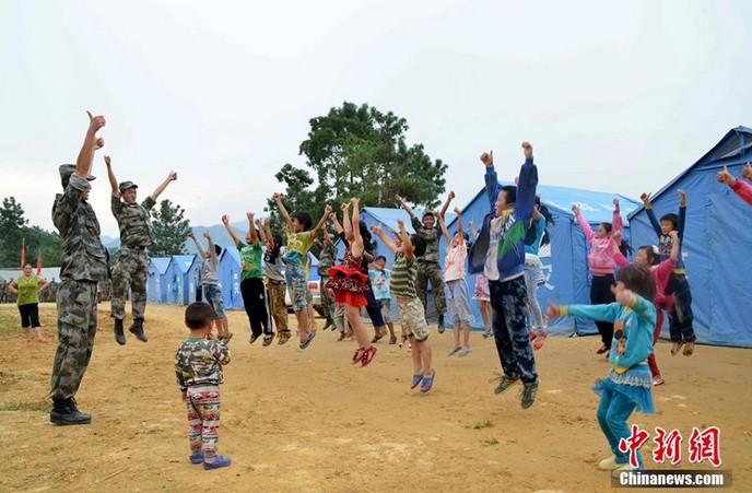 “你是我的小呀小苹果,怎么爱你都不嫌多,红红的小脸儿温暖我的心窝,点亮我生命的火,火火火火火。”为帮灾区孩子走出地震阴影,连日来,解放军陆军第十三集团军红军师炮兵团官兵在巧家县新店镇震区教小朋友跳小苹果。图为解放军教灾区小朋友跳“小苹果”。于炜彬 摄