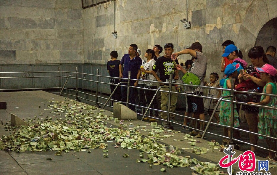 中国网8月15日讯 2014年8月14日,北京昌平区,5A级景区明十三陵定陵地宫内,历史文物上游客祈福所投过去的钱币堆成了小山,没有工作人员制止清理。