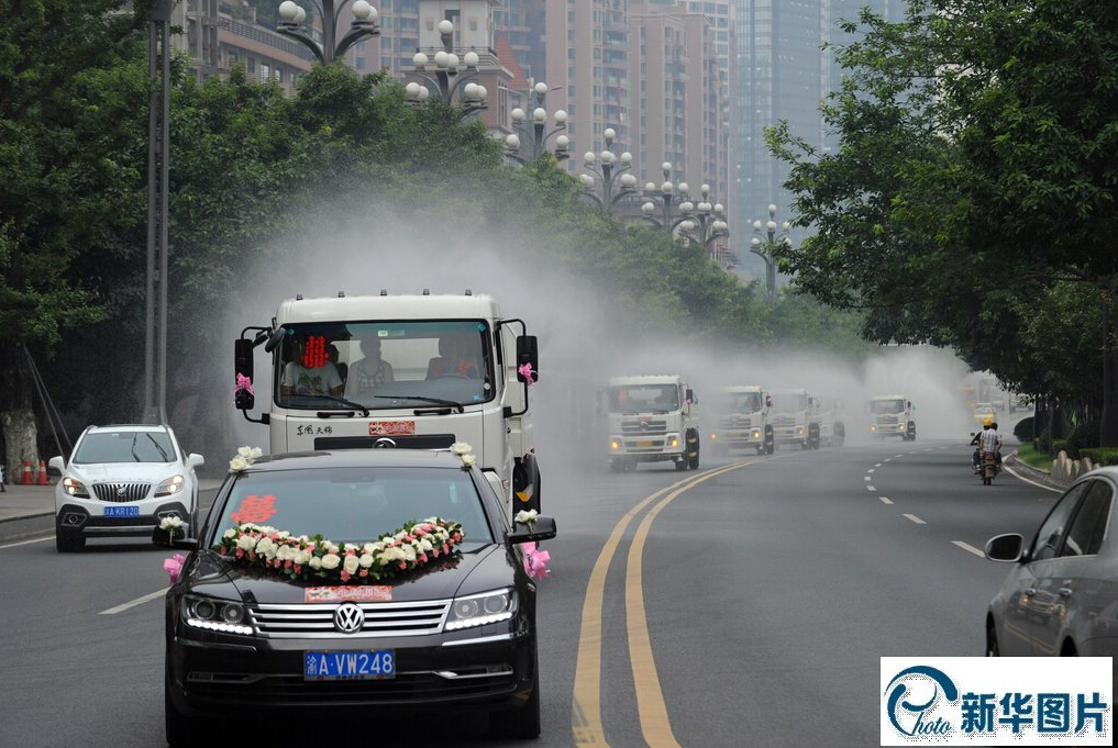 2014年8月15日,重庆,一对新人结婚用12辆环卫车洒水迎亲。浩浩荡荡的婚车队伍。