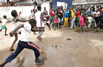 8月16日,利比里亚首都蒙罗维亚,一名男子抱着一个女孩从一个埃博拉隔离区中跑出。