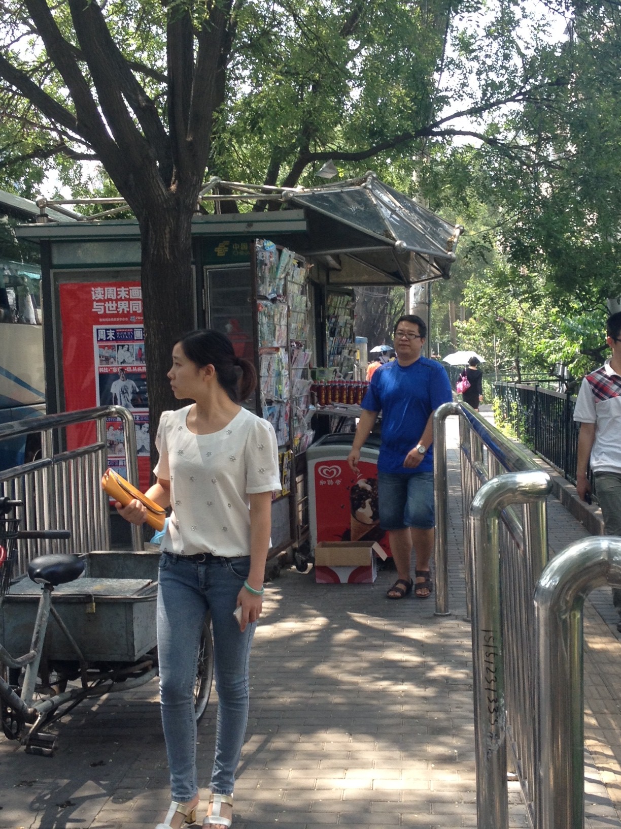 ▲占道的报刊亭 拍摄时间:8月14日中午 拍摄地点:北京西三环航天桥西北角。此路段为多路公交车??空荆嗽泵芗?,人行道非常狭窄,占道的报刊亭严重影响行人的通行。