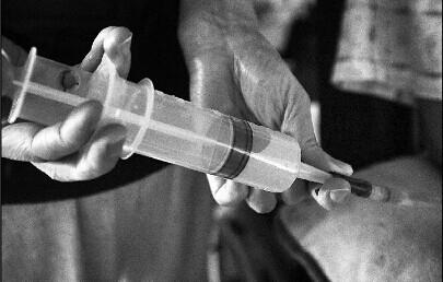 面部肌肉萎缩,造成不能咀嚼,家人要用针管给他注射营养液维持体力