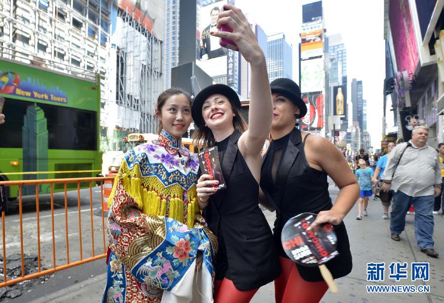 8月19日,北京京剧院梅兰芳京剧团青年演员王梦婷(左一)在纽约时报广场与百老汇的演员们互动推介京剧艺术。
