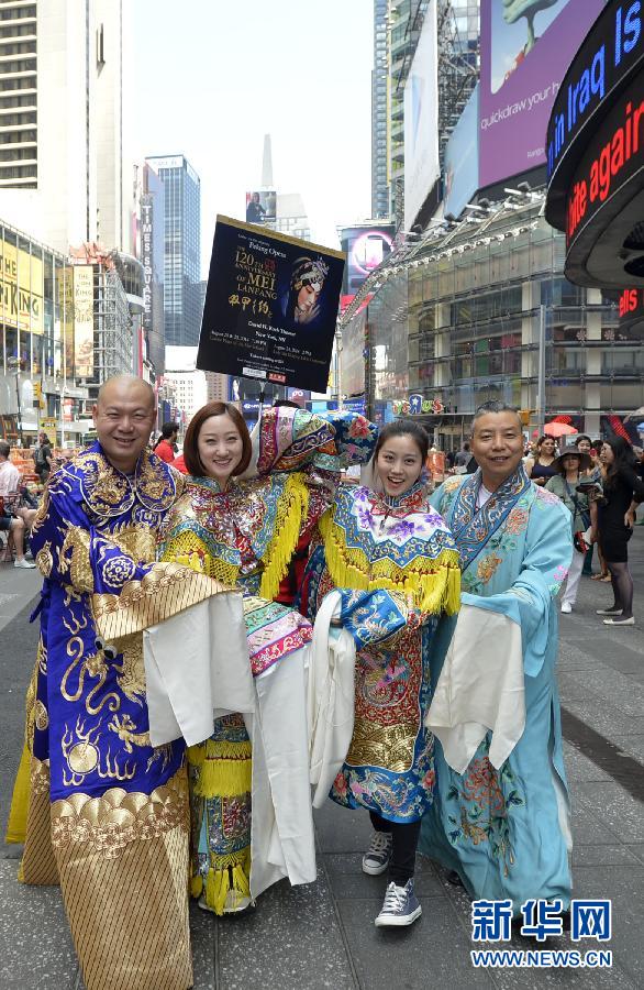 8月19日,北京京剧院梅兰芳京剧团青年演员王梦婷在纽约时报广场身着戏服向游客推介京剧艺术。
