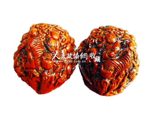 这对文玩核桃直径约46毫米,其大小、轻重及纹理基本相同。由于存世较早,盘玩日久,即经过人手长期的揉搓、油脂的浸润和人气的熏陶,核桃表面早已形成厚润亮泽的玻璃状包浆,色泽透红,光润如玉,精美无比。核桃在纹饰设计与雕刻技法方面同样有独到之处,作者因材施艺,依形就势,采用浮雕技法,在两只核桃表面雕刻出纹饰相同的十八罗汉图。十八罗汉高矮胖瘦不同,面容神态各异,个个栩栩如生。有的安悠自在、哈欠伸腰;有的傲视太虚、超脱凡尘;有的蚕眉弯曲、秀目圆睁;有的欢喜如意、其乐融融。核桃整体构图疏密有致,密而不乱,雕法娴熟,刀工圆润,艺术水平高超,令人爱不释手。