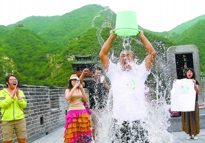 日前,一群年轻人在居庸关长城上进行“冰桶挑战”。近来,“ASL冰桶挑战”席卷全球,数据显示目前中国渐冻症患者有20多万人。本报特约摄影 于志强