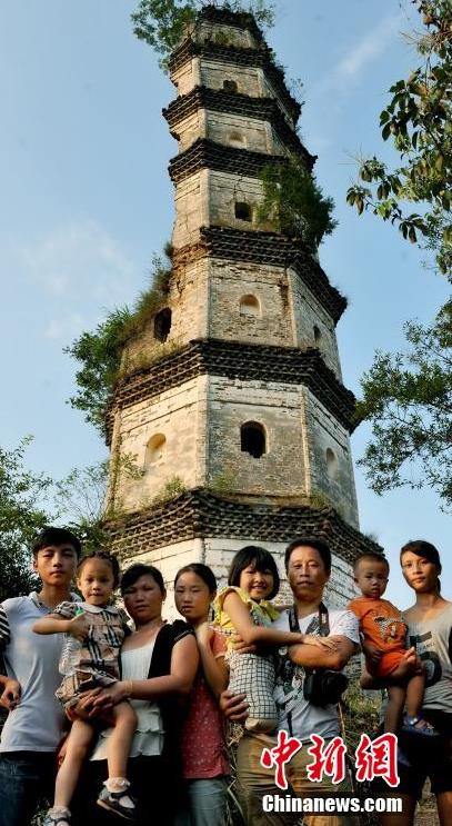 图为8月25日,游客和“无腿女孩”蒋张子怡在江西省德兴市黄柏乡尚和村半边古塔前合影留念。卓忠伟 摄