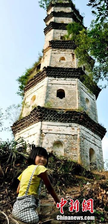 图为8月25日,“无腿女孩”蒋张子怡美丽的笑容与坚挺400多年的半边古塔相应成趣。卓忠伟 摄