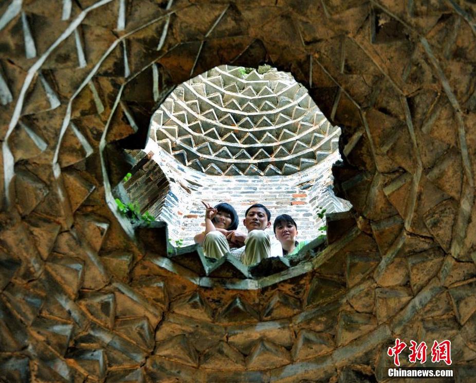 图为8月25日,“无腿女孩”蒋张子怡在父母的保护下在塔内参观。卓忠伟 摄