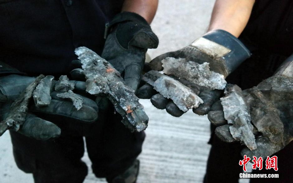 8月26日,香港北角一建筑工地发现二战时日军遗留的炸弹,警方先后两次引爆。警方爆炸品处理主任李展超说,引爆的是一颗穿甲弹,直径约15厘米,重约36公斤,由于弹壳较厚,首次引爆未能完全切开弹壳,要第二次才可完全引爆。炸弹具威协力,第二次引爆时,警方用100个沙袋覆盖,碎片仍飞至100米外,若在一般情况下爆炸,将构成危险。图为警方展示炸弹碎片。中新社发 张宇 摄