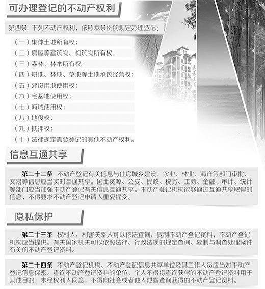 据了解,目前在我国,建设用地使用权和集体土地所有权等由国土资源部门登记,房屋所有权等由住房和城乡建设部门登记,林地所有权和使用权由林业部门登记,水面、滩涂的养殖使用权由渔业部门登记,海域使用权则由海洋部门登记。