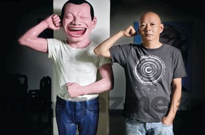 几经波折,终于在一条窄巷里找到目的地。红砖墙的院子门口,正堵着一台起重机,半截傻笑人的铜雕在工人的吆喝下被高高吊起,被“腰斩”的傻笑人依然没心没肺地咧着嘴,臃肿的轮廓恣意地摊在卡车厢上,像极了案板上片好的熟牛肉,闪着一样的彩色金属光泽。岳敏君慢慢地从院子里走出来,看着雕塑解释,“这是运去上海参加当代艺术展的,他们觉得我的雕塑可以,就挑了两个。”脸上表情严肃,丝毫不见当年傻笑人的影子。