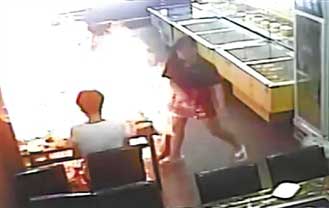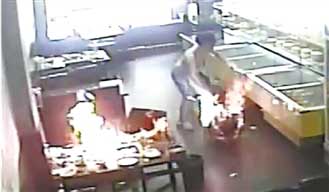 15秒之后,服务员小珊拿着一个大的玻璃瓶走了过来,瓶子里大概还剩下五分之一的酒精。走到小倩位置后,小珊拧开了瓶口,直接拿起瓶子往炉子里倒酒精。就在酒精接触到火锅炉的一刻,火焰径直喷射出来,瞬间吞没了小倩,当时火焰猛烈得冲上了房顶。