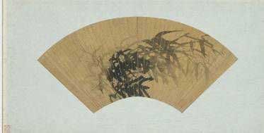 唐寅画竹叶,行笔挥洒,笔势跌宕,遒劲有力。又以深浅层次变化丰富的墨色,营造出远近前后的空间关系以及叶片正侧背向。风雨中竹叶飞舞的动态一表无遗?;瘢运值鹘谀?,形成多层次的浓淡干湿,在吸水性慢的“金笺”写竹,水分渗透感倍觉湿润,正如竹叶承雨,本幅湿气氤氲,笔墨淋漓,气韵酣畅,即是一例。