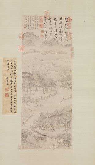 此轴景物繁复,溪流蜿蜒上升贯穿画面,两岸配置林木屋舍和稻田,背景是远山,清楚交代空间深度。其笔若游丝,细腻生动。弘治十八年(1505),唐寅三十六岁,曾作《南游图》(美国佛利尔美术馆藏)赠送琴师杨季静,笔墨与本作有不少相通之处,故推测此轴可能也绘成于此期。