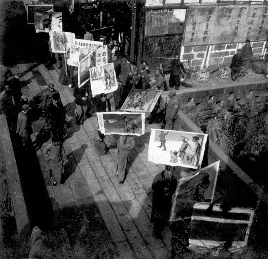 上世纪30年代末,抗日漫画宣传队队员在街头向民众宣传抗日。
