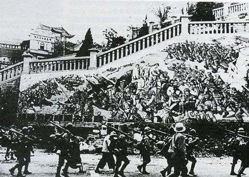 1938年武汉沦陷后,日军行经武汉黄鹤楼大壁画《抗战必胜》,随军记者拍下这一照片,随后日军将壁画损坏。