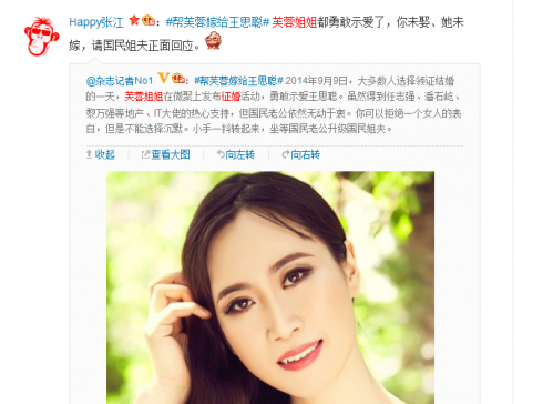 随后,她还在微博@王思聪,称欢迎“这样优秀的男人报名。我在等你。”有趣的是,该微博引来“大V”们的热情转发,从任志强转到潘石屹,潘石屹将此条“传”给了王石,却未见王石回应。