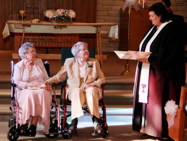 91岁的维维安·博亚克和90岁的艾丽斯·杜比本月6日在美国艾奥瓦州完婚。她俩在少年时代相识,此后相伴72年。70多年间,她俩游遍美国50个州和加拿大所有省,还去了两次英格兰。过去,受法律限制,两人始终没有举行婚礼。艾奥瓦州2009年批准同性婚姻后,两人开始考虑开启生活的新篇章。在婚礼上,她们各自坐在轮椅上,听牧师念婚词,艾丽斯还把手搭在维维安的手上。“我们度过了美好时光,”艾丽斯说。(凌朔)