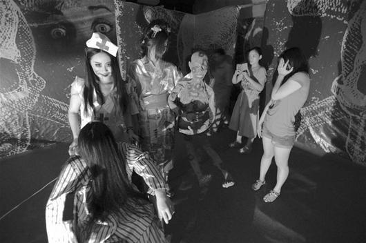狭窄的走廊里只容一个人侧身通过,墙上的镜片在幽暗的灯光下泛出冷光,不知何时镜中出现一张鬼脸;前一秒还对你和颜悦色的花魁,伴随着诡异的音乐,下一秒微笑着口吐鲜血……昨日,楚天金报记者提前探访“鬼屋”,走一圈下来手心直冒冷汗。