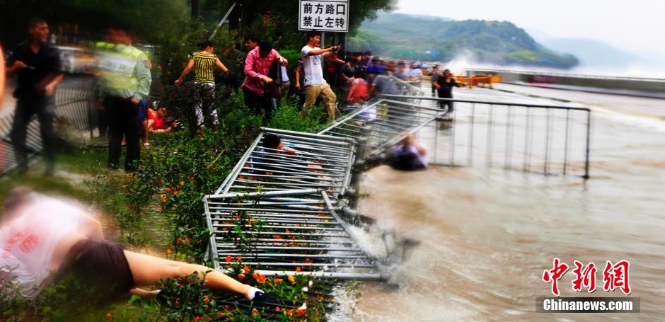 9月11日,农历八月十八,一年一度的钱塘江潮水达到顶峰,钱江沿岸聚焦数万观潮者。在九溪珊瑚沙水闸,潮水的冲击力极强,掀翻护栏、电动车和观潮人群,多人受伤。 中新社发 陈加华 摄