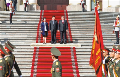 当天上午,习近平和夫人彭丽媛向塔吉克斯坦民族和解与复兴纪念碑献花圈。