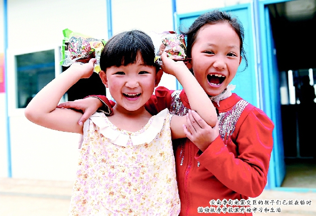云南鲁甸地震灾区的孩子们已经在临时活动板房学校里开始学习和生活