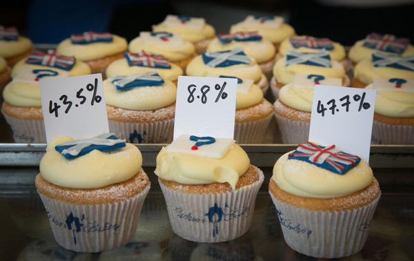 图片说明:2014年9月17日,苏格兰爱丁堡的杜鹃面包店透露说,该店从今年3月7日开始售卖印有“要”、“不要”和“还没决定”的纸杯蛋糕,现在,“纸杯蛋糕公投”的计票结果显示,“不要”的支持率是47.7%,“要”的支持率是43.5%,“还没决定”的支持率是8.8%。