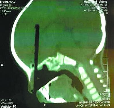 万幸的是城城虽然哭吵不止不能说话,但意识尚清醒,四肢活动正常,没有发生大出血。但家人却对这根筷子不敢轻举妄动,4个小时后,城城被送到武汉协和医院神经外科,符荣副教授和雷德强主治医师通过三维CT检查发现:筷子由左侧鼻腔插入大脑足足有8厘米(见右图),幸运的是筷子并没有伤到大血管和神经,家长也没有擅自拔出筷子。