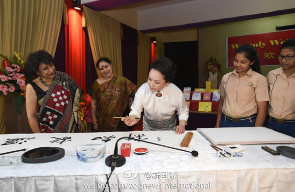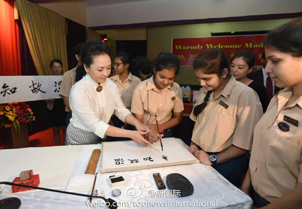 新华网北京9月18日电 据新华社“新国际”微博报道,习近平主席夫人彭丽媛18日上午在新德里参观泰戈尔国际学校时,用毛笔书写成语“温故知新”,并签名盖上印章。她对师生们逐字讲解后说,我们要经常温习学过的知识,不断学习掌握新知识,开拓创新,与时俱进。希望同学们认真学习,更好报效祖国,祝你们成功。